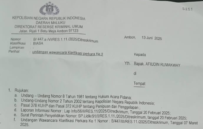 Guna tindak lanjut dari perkara tersebut, dimohon saudara untuk hadir memberikan keterangan dan menemui penyidik selaku saksi Pada tanggal kamis 19 Juni 2025 pada pukul 10:00 WIT ruang Subdit III Dit Reskrimum Polda Maluku dengan membawa dokumen terkait serta dokumen pendukung lainnya yang berhubungan dengan dugaan tindak pidana/perkara tersebut.