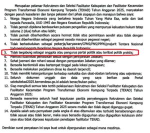 Pentauan media ini, di Kabupaten Seram Bagian Timur ada beberapa peserta merupakan anggota partai politik yang berkontestasi pada pileg 2024 lalu, termasuk diduga kuat ketua DPD PAN SBT juga mengikuti seleksi TEKAD, sehingga kementeriaan Desa sudah harus menunjukan profesionalitas dengan tidak meluluskan para anggota Parpol.
