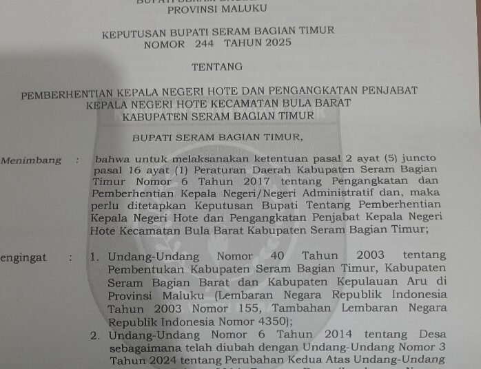 SBT, Kilaskota.com —Surat Keputusan nomor 244 tahun 2025 Tentang Pemberhentian Kepala Negeri Hote dan Pengangkatan Penjabat Kepala Negeri Hote Kecamatan Bula Barat diteken Bupati SBT, Fachri Husni Alkatiri tertanggal 23 Mei 2025.