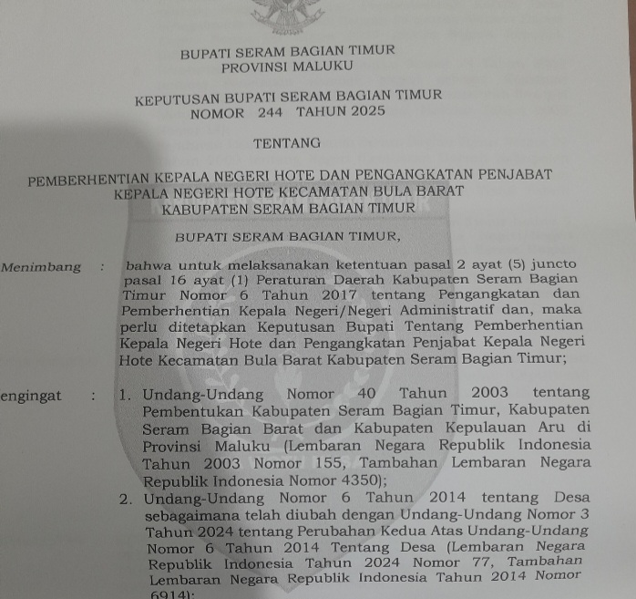 SBT, Kilaskota.com —Surat Keputusan nomor 244 tahun 2025 Tentang Pemberhentian Kepala Negeri Hote dan Pengangkatan Penjabat Kepala Negeri Hote Kecamatan Bula Barat diteken Bupati SBT, Fachri Husni Alkatiri tertanggal 23 Mei 2025.