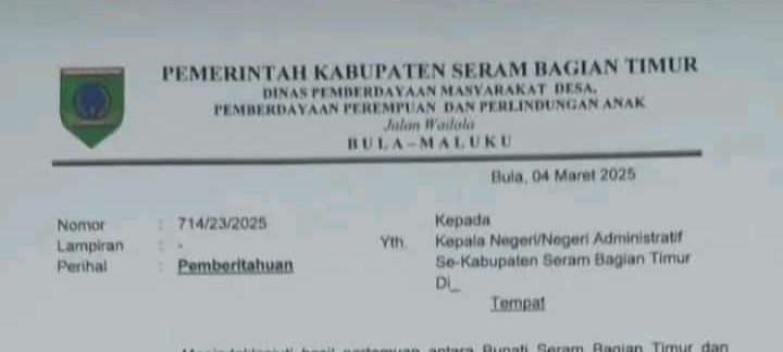 Surat pemberitahuan tersebut dikeluarkan berdasarkan hasil pertemuan antara Bupati Seram Bagian Timur, Fachri Husni Alkatiry dan para pimpinan OPD dalam lingkup Pemkab SBT tertanggal 03 maret 2025. Atas arahan Bupati, Dinas PMD menerbitkan surat pemberitahuan yang ditujukan kepada para Kepala Pemerintah Negeri dan Negeri Administratif beserta perangkat agar terus berkantor.