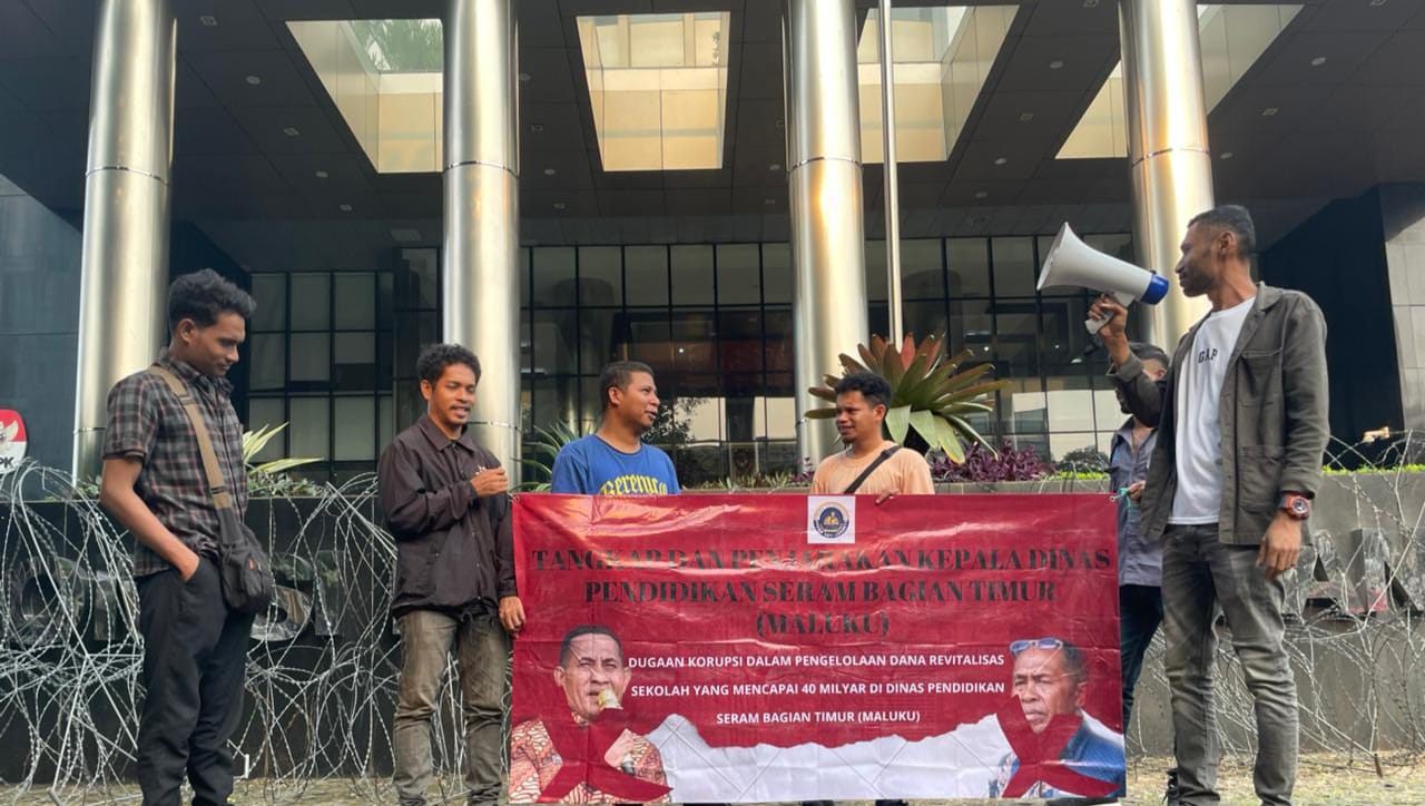 Aksi unjuk rasa di depan gedung Komisi Pemberantasan Korupsi (KPK). Mereka membawa spanduk berwarna merah dan menggunakan megafon untuk menyampaikan tuntutan mereka, atas dugaan penerimaan fee yang diduga melibatkan kepala dinas pendidikan SBT, Afiudin Rumakway dan Sekretaris Dinas Pendidikan Abdul Kadir Lausiry